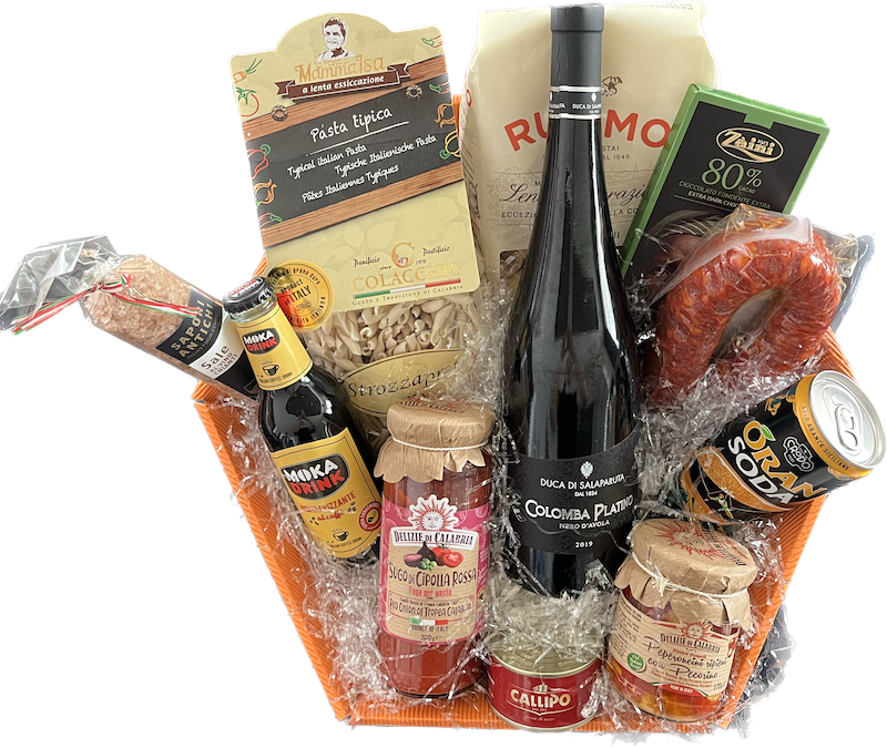 Dárkový koš DECIMUS plný vynikajících italských potravin. Mimo jiné v něm naleznete mořskou sůl s příchutí Chianti, oblíbený kávový nápoj, velmi kvalitní těstoviny a nechybí ani špičková italská klobása.