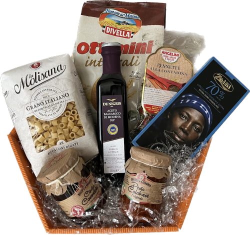 Dárkový koš MARCUS je plný fantastických dobrot z Itálie, a to převážně z jižní slunné Kalábrie. Mezi jinými, v tomto koši naleznete např: tradiční pesto Calabrese, vynikající těstoviny, balsamikový ocet, nebo vynikající sušenky.