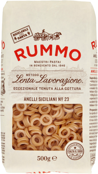 Rummo Anelli Siciliani n.23 jsou kvalitní italské těstoviny ve tvaru kroužků, perfektní pro zachycení omáček a přípravu sicilských specialit. Vyrobené z prvotřídní semoliny a řemeslně zpracované pro dosažení optimální struktury, tyto těstoviny v balení 500 g jsou ideální volbou pro milovníky autentické italské kuchyně, kteří chtějí do svého jídla vnést kousek Itálie.