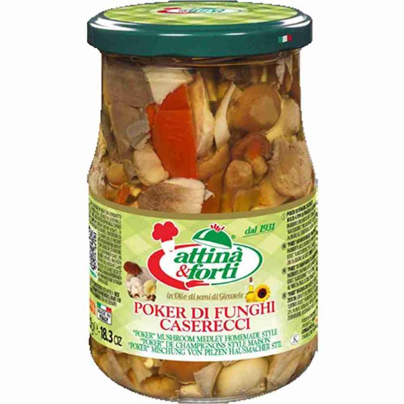 Attinà & Forti Poker di Funghi Caserecci je lahodná směs čerstvých hub v slunečnicovém oleji, ochucená česnekem, kořením a octem. Tento výrobek je ideální jako příloha k masu, těstovinám nebo na obohacení studených předkrmů. Díky pasterizaci a pečlivé přípravě si houby uchovávají svou přirozenou chuť a vůni.