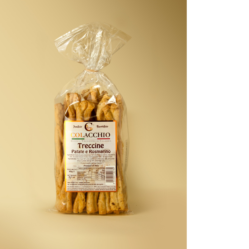 Colacchio Treccine Patate e Rosmarino jsou lahodné křupavé tyčinky vyráběné podle tradiční kalábrijské receptury. Jejich jedinečná chuť je dosažena přidáním bramborových vloček a aromatického rozmarýnu, což je činí ideálními pro podávání s červeným vínem, výraznými sýry, saláty nebo jako chutný snack kdykoliv během dne.