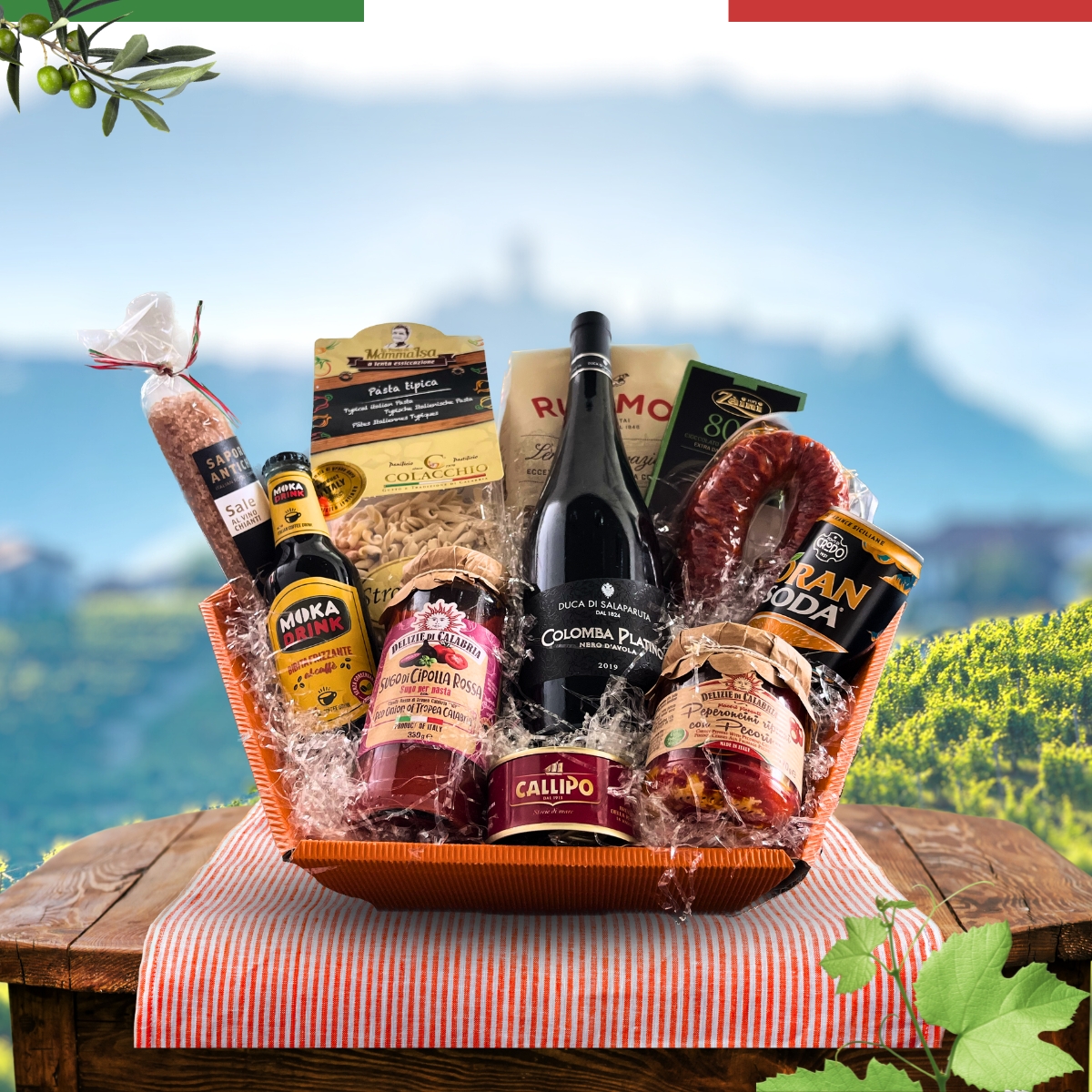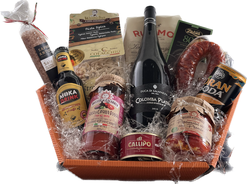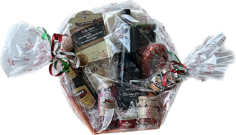 Dárkový koš DECIMUS plný vynikajících italských potravin. Mimo jiné v něm naleznete mořskou sůl s příchutí Chianti, oblíbený kávový nápoj, velmi kvalitní těstoviny a nechybí ani špičková italská klobása.