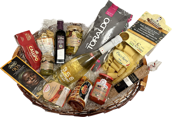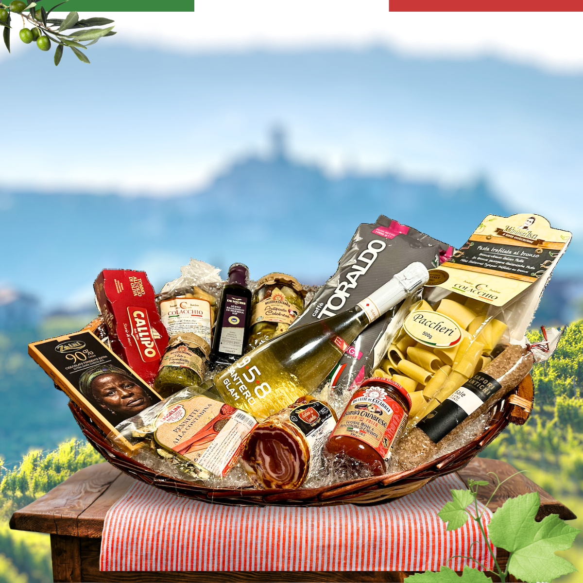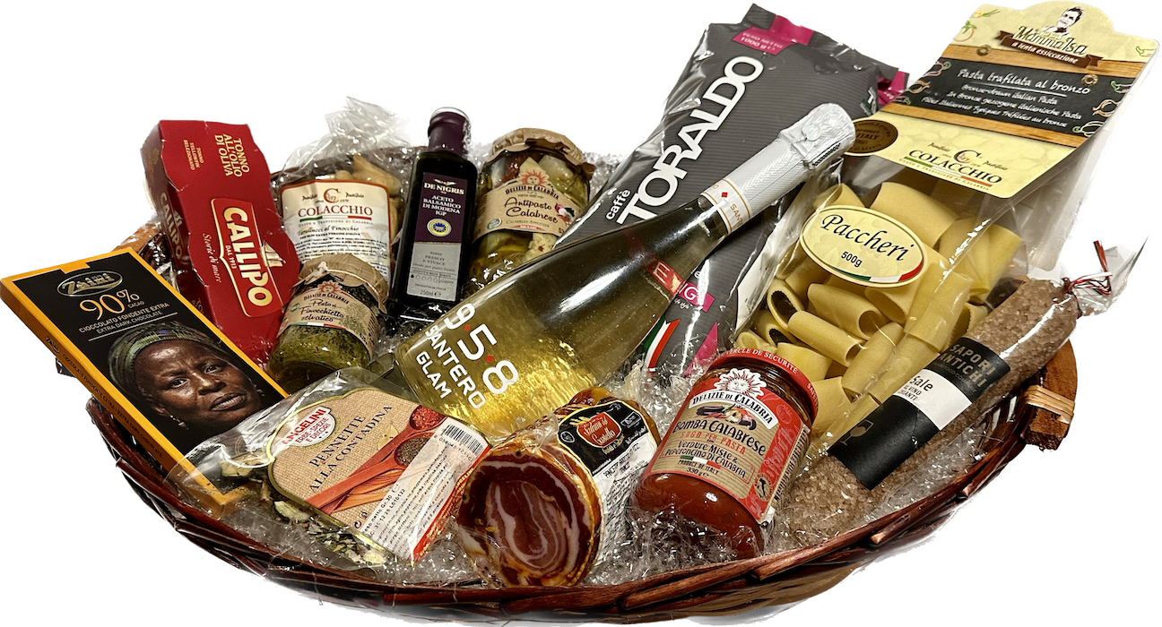 Dárkový koš GIULIO CESARE je plný fantastických dobrot z Itálie, a to převážně z jižní slunné Kalábrie. Mezi jinými, v tomto koši naleznete úžasnou italskou tradiční slaninu "Panchetta", zrnkovou kávu Toraldo, pesto z divokého feniklu nebo také úžasné prosecco 958 Santero.