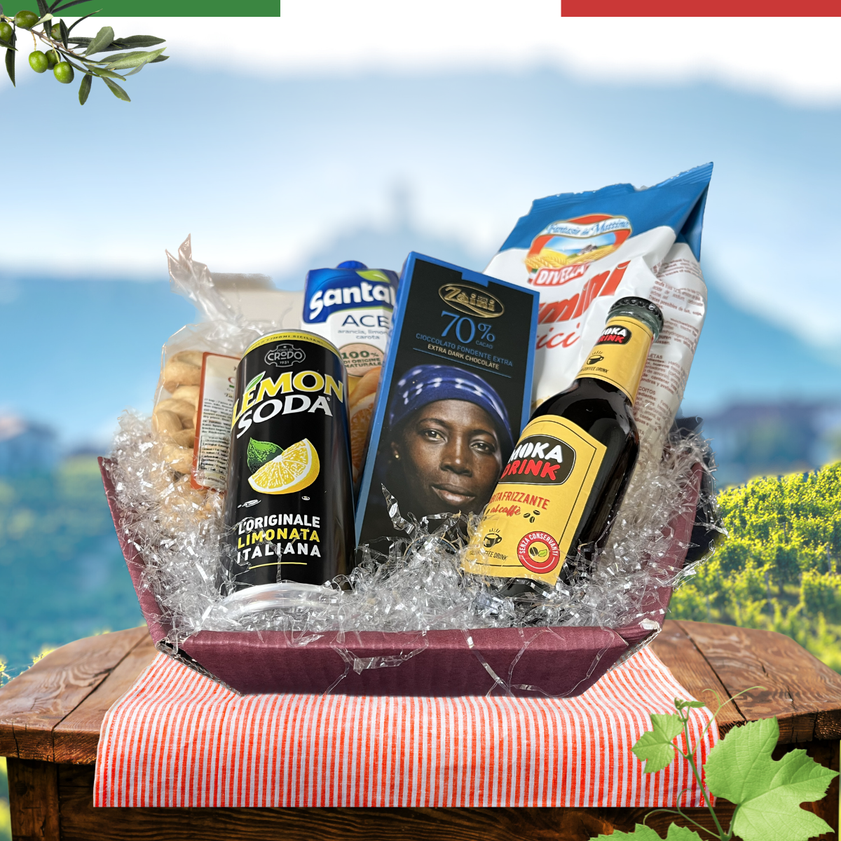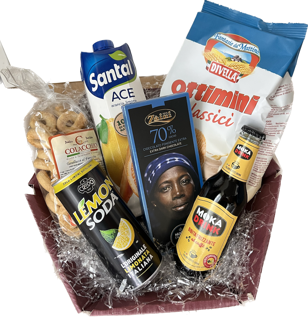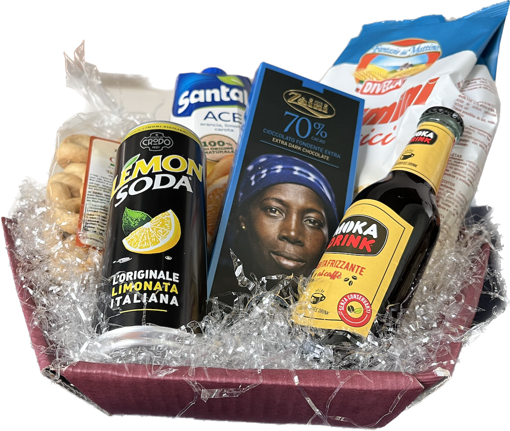 Dárkový koš LUCIUS je plný fantastických dobrot z Itálie, a to převážně z jižní slunné Kalábrie. Mezi jinými, v tomto koši naleznete fantastickou italskou limonádu, sušenky Colacchio, vynikající hořkou čokoládu, nebo také oblíbený kávový drink.