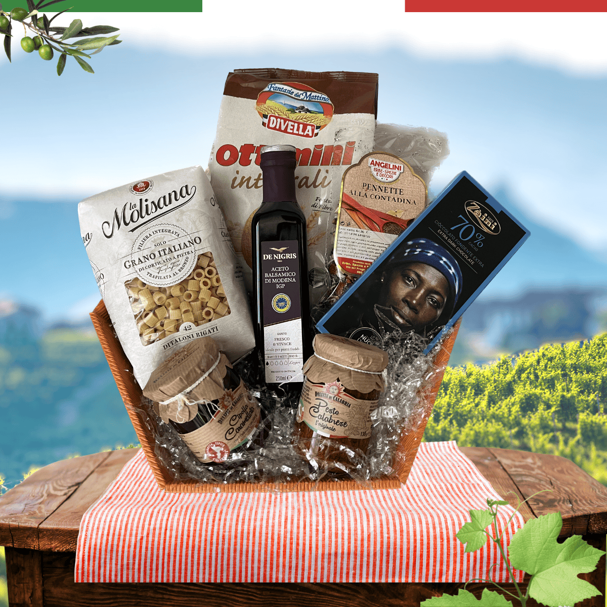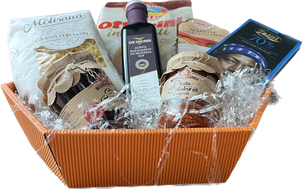Dárkový koš MARCUS je plný fantastických dobrot z Itálie, a to převážně z jižní slunné Kalábrie. Mezi jinými, v tomto koši naleznete např: tradiční pesto Calabrese, vynikající těstoviny, balsamikový ocet, nebo vynikající sušenky.