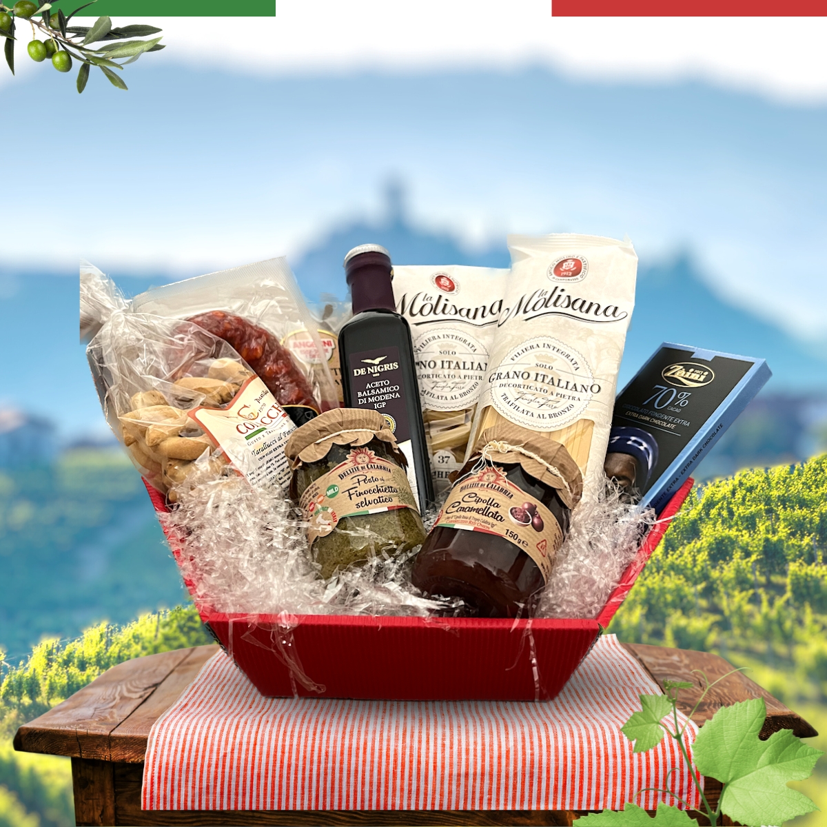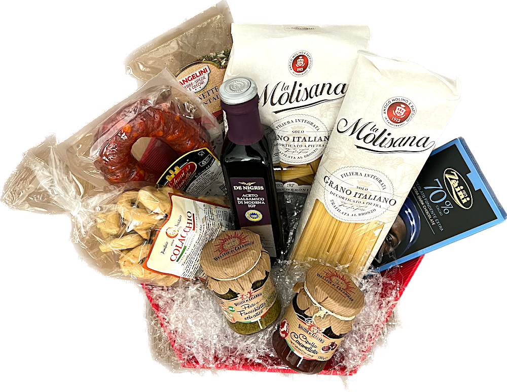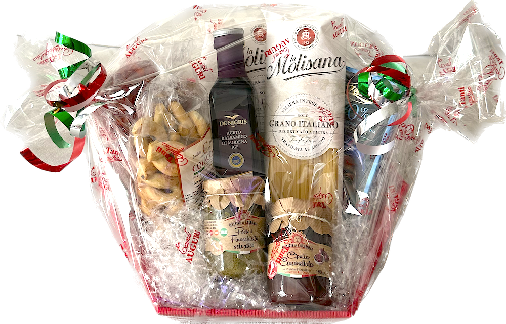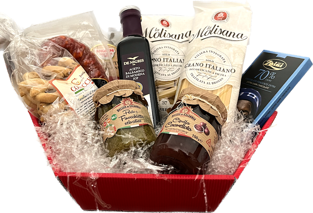 Dárkový koš NONUS je plný fantastických dobrot z Itálie, a to převážně z jižní slunné Kalábrie. Mezi jinými, v tomto koši naleznete fantastickou italskou klobásu, sušenky Colacchio, vynikající hořkou čokoládu, nebo také pesto z divokého fenyklu a fantastickou směs koření.