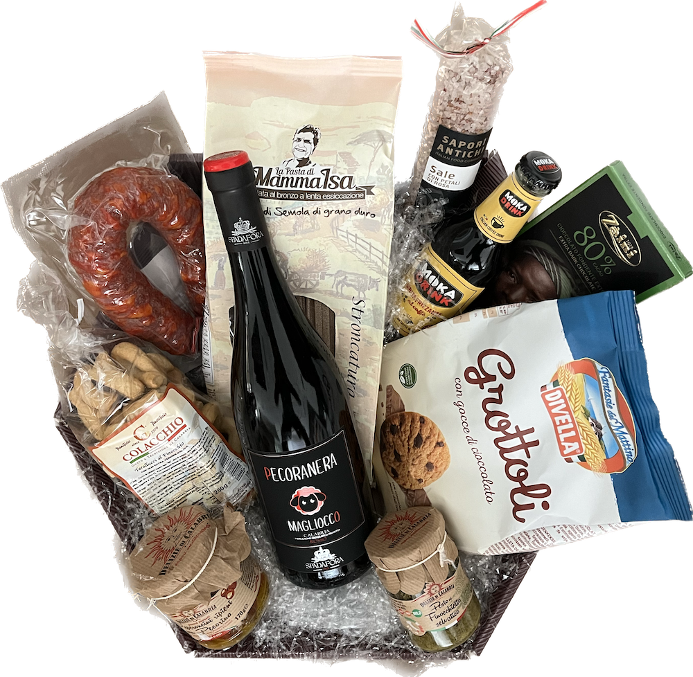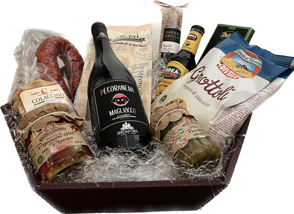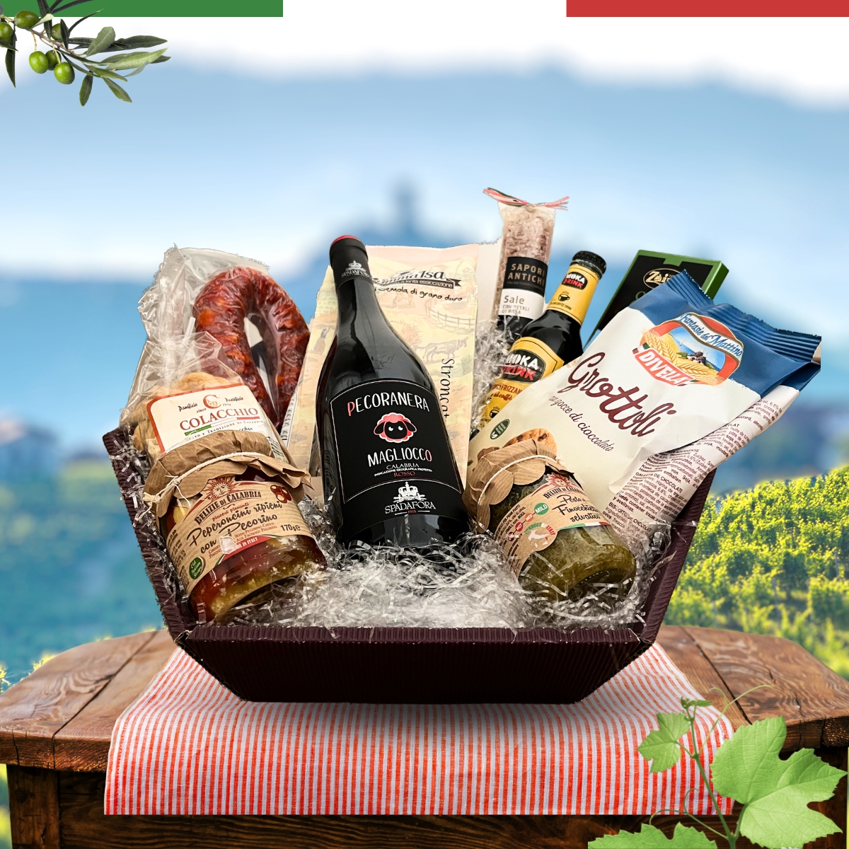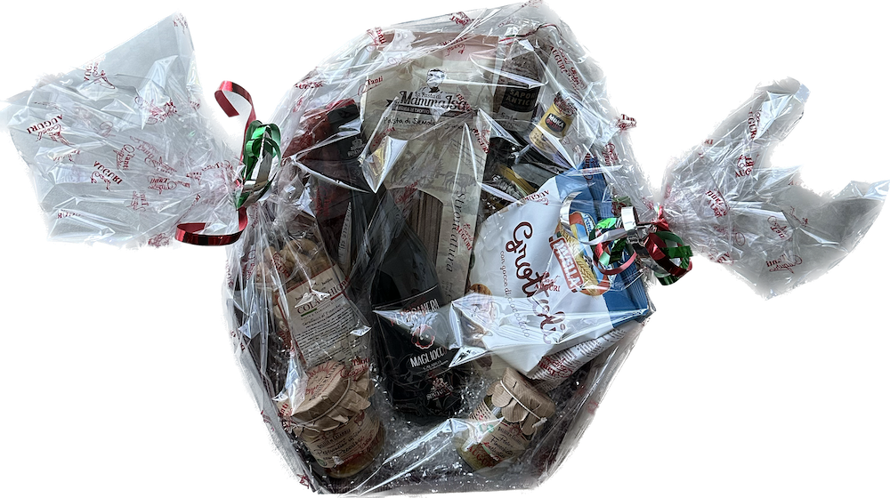 Dárkový koš OCTAVIUS plný vynikajících italských potravin. Mimo jiné v něm naleznete mořskou sůl s příchutí Chianti, oblíbený kávový nápoj, velmi kvalitní těstoviny, nebo také špičková italská klobása, vynikající červené víno a pesto z divokého fenyklu.