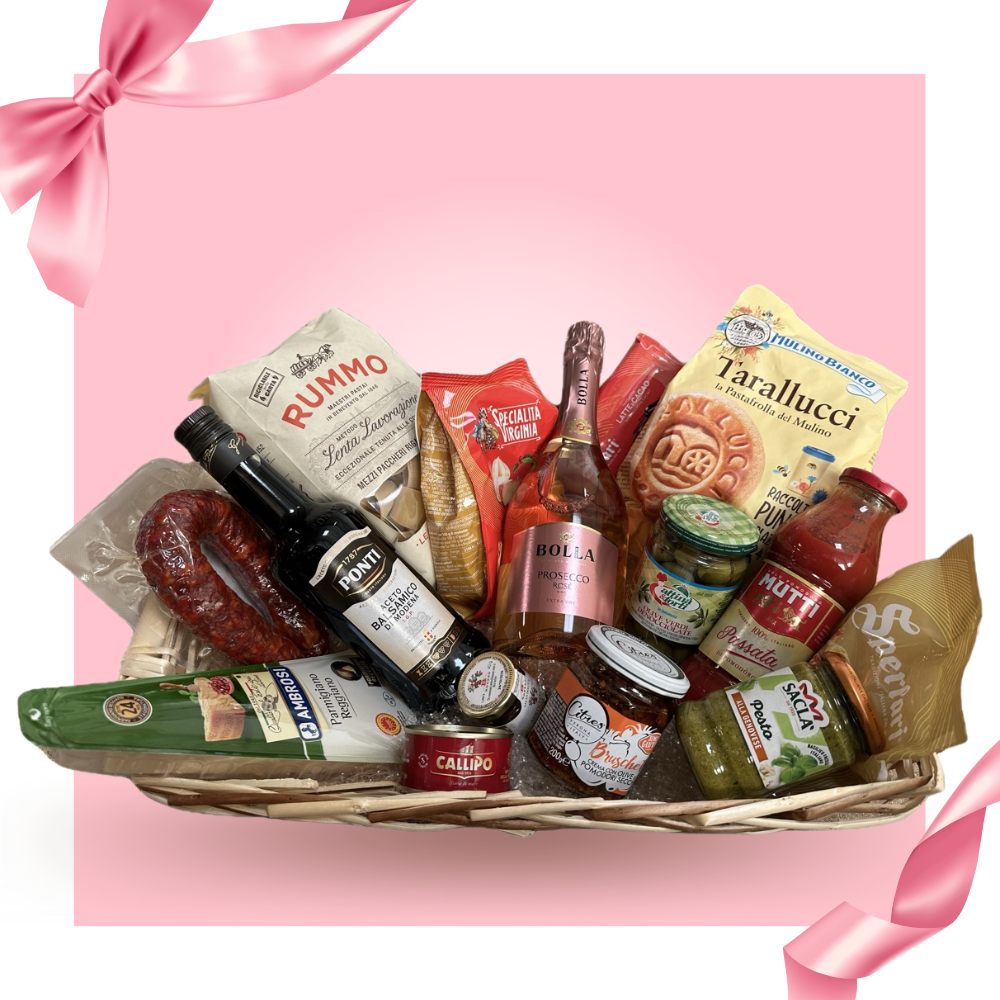 Překvapte svou drahou polovičku pravou chutí Itálie! Tento luxusní dárkový koš plný autentických italských pochoutek je ideální pro romantický večer ve dvou. Najdete v něm vybrané delikatesy, které potěší všechny smysly – od jemného růžového prosecca po lahodné sýry, sušenky a delikátní omáčky.