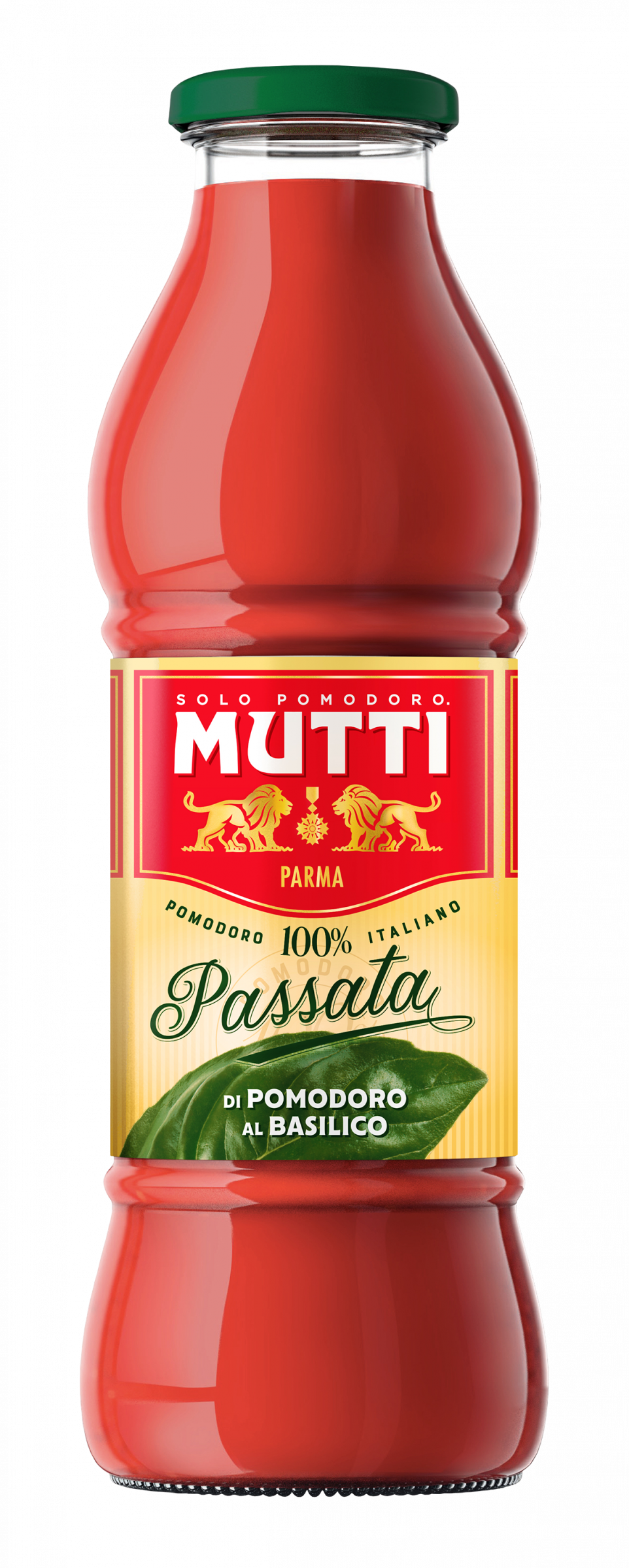 Krémové a fantasticky voňavé rajčatové pyré Mutti Passata di Pomodoro al Basilico jako klasická Passata s přidáním celého čerstvého lístku bazalky pro ještě chutnější vůni. Zvláště vhodné pro přípravu rychlých omáček k těstovinám.