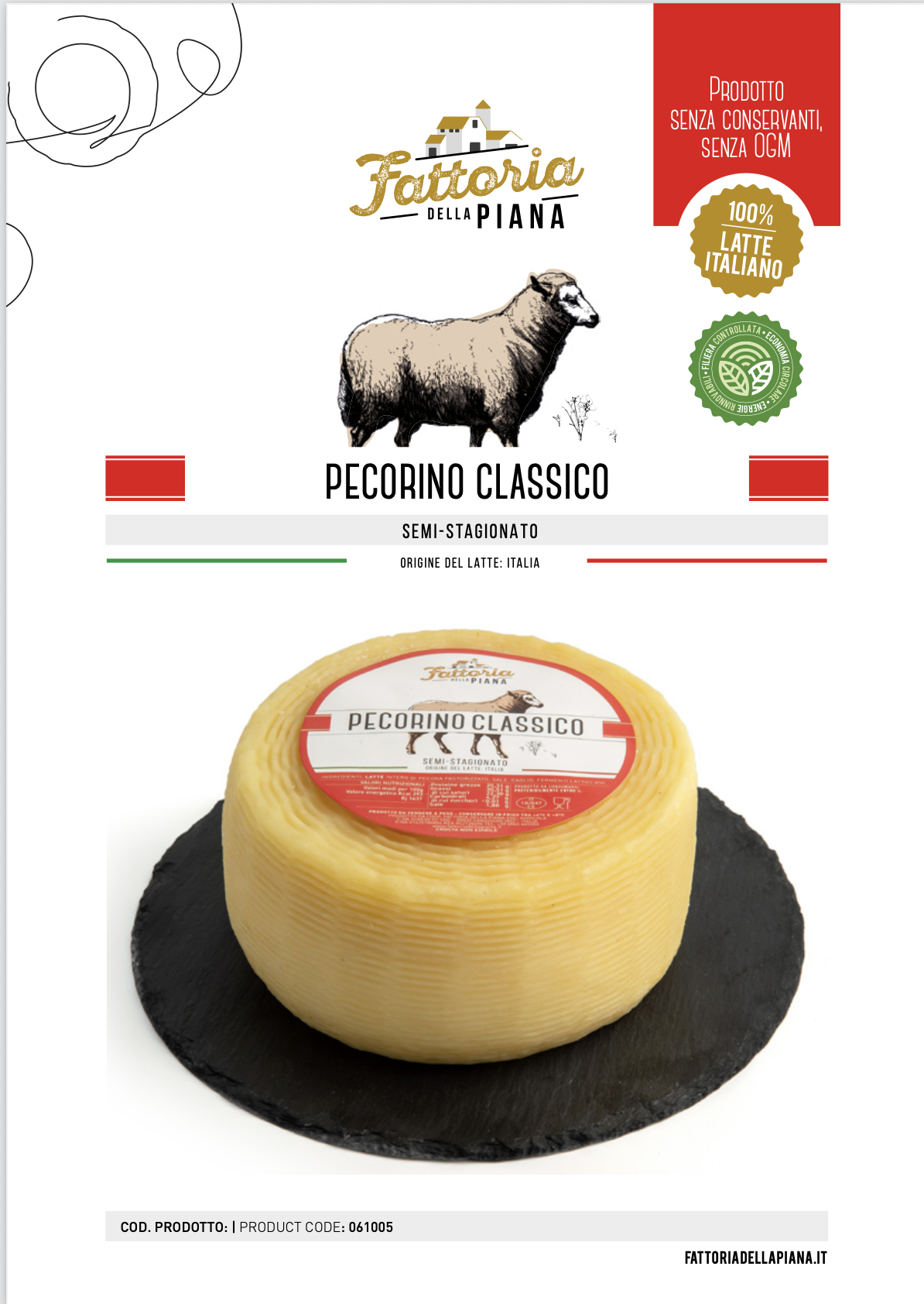 Polotvrdý sýr Fattoria della Piana Pecorino Classico z ovčího mléka je tradiční italskou pochoutkou. Chuť je jemná při zachování silných tónů typických pro ovčí mléko.