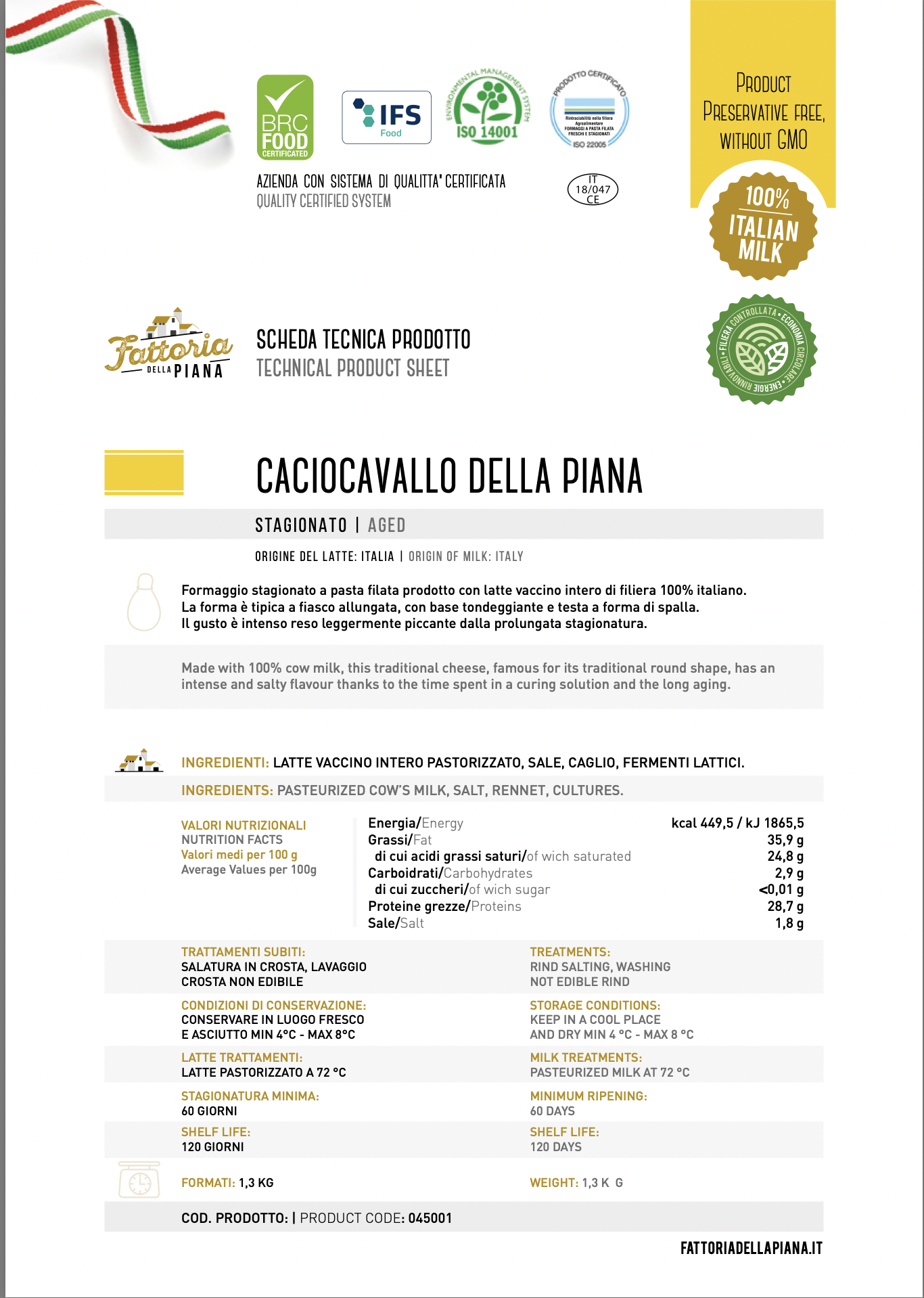 Tradiční italský sýr Caciocavallo vyrobený z plnotučného kravského mléka ze 100% italského dodavatelského řetězce. Tvar je typický pro podlouhlou baňku, se zaobleným dnem a hlavou ve tvaru ramene. Chuť je intenzivní, mírně pikantní a to díky prodloužené době zrání.